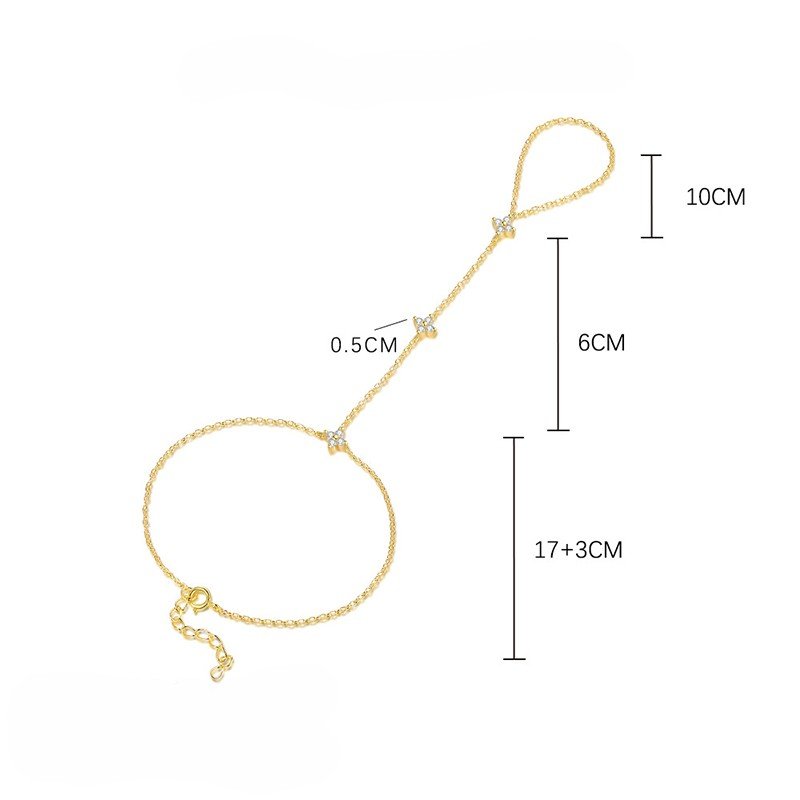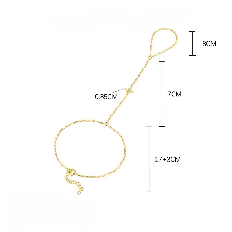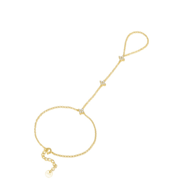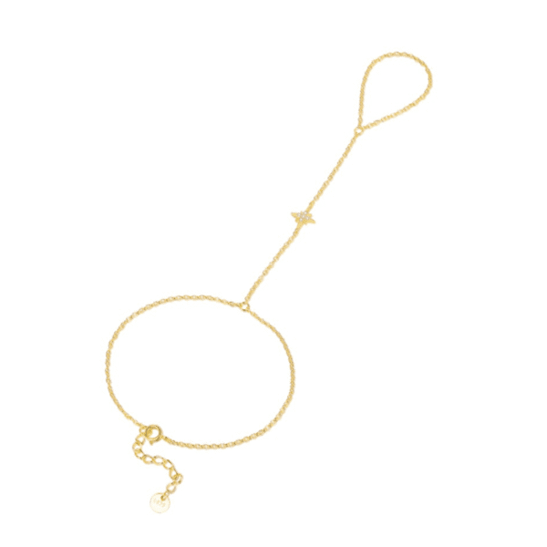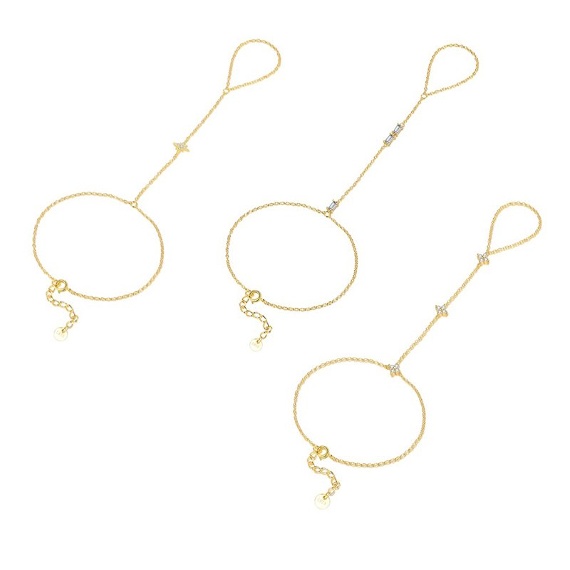 Available in three enchanting designs – star, square, and flower – each bracelet features a dainty hand chain that gracefully connects from wrist to finger, adding a touch of elegance to your look. The shimmering zirconia stones catch the light effortlessly, creating a refined sparkle with every movement.
