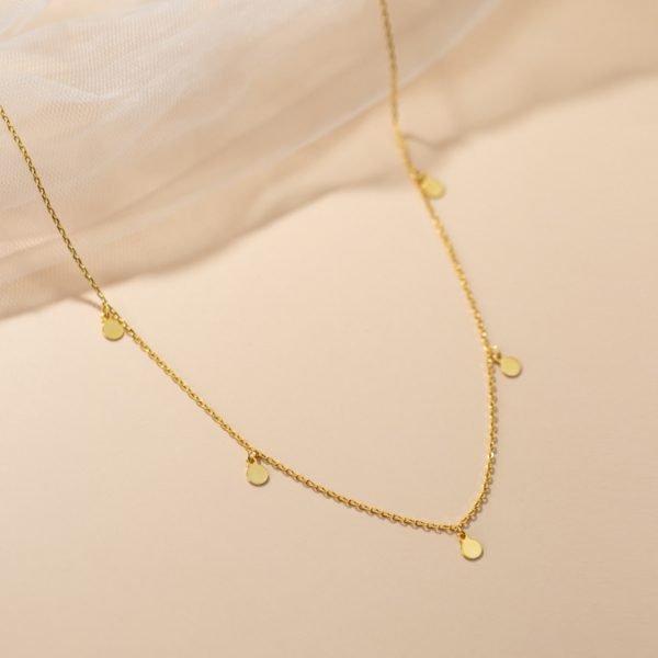 The sleek and minimalist design of the necklace adds a touch of chic sophistication to any outfit. The glossy discs create a subtle shimmer and catch the light, adding a touch of elegance and charm to your neckline.