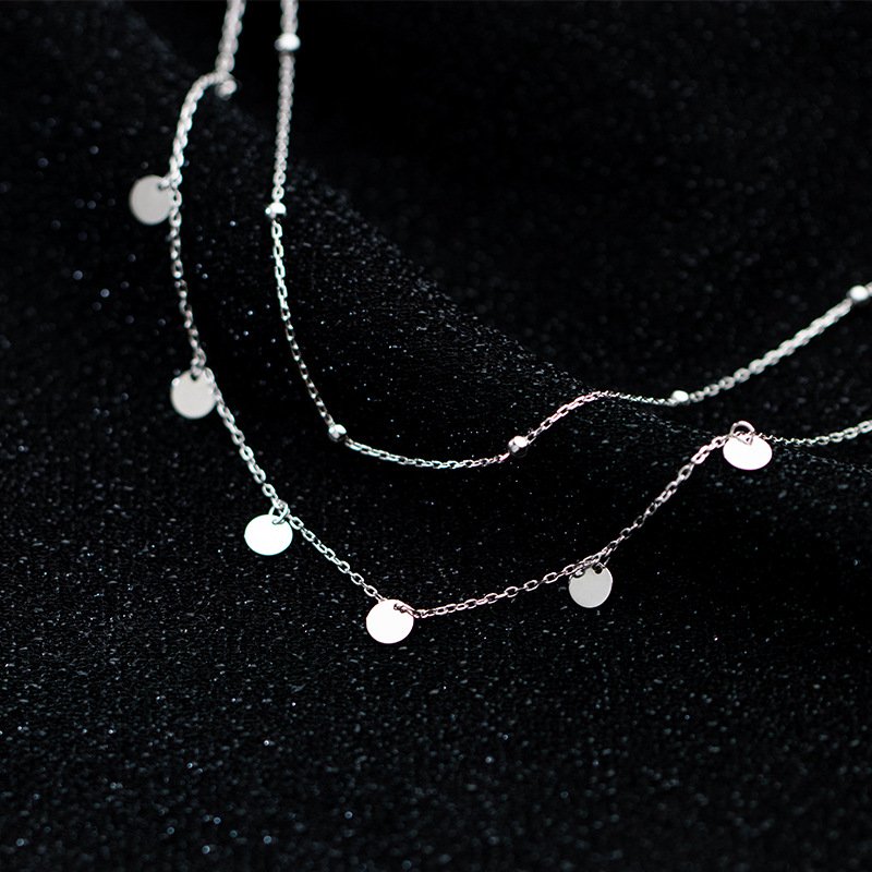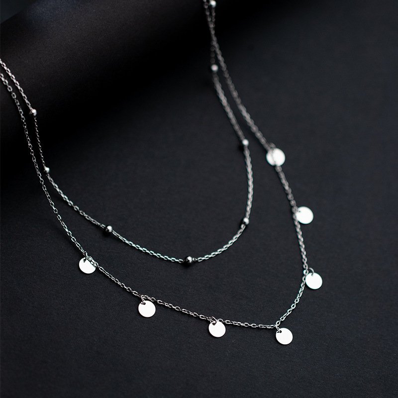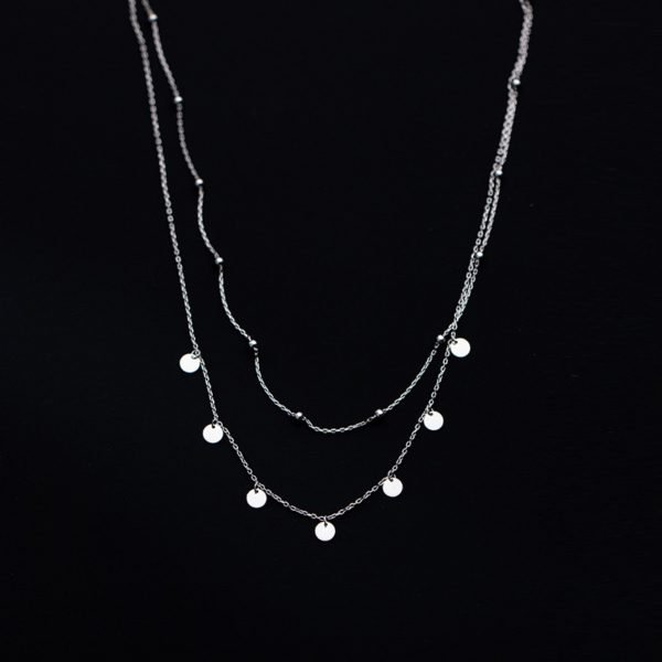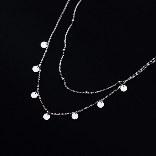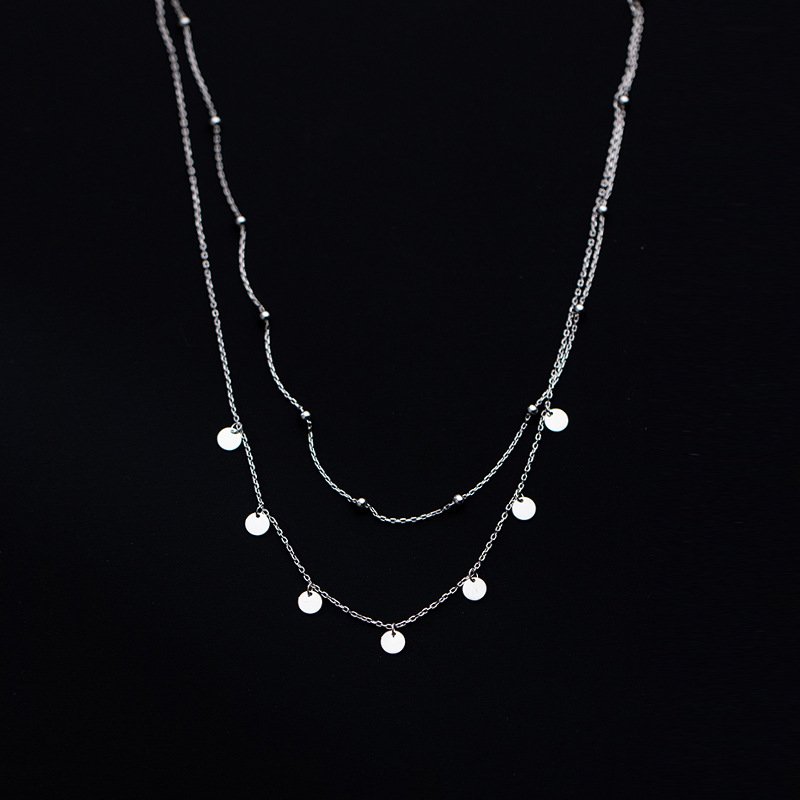 The smaller chain is adorned with small beads, enhancing the overall aesthetic and adding a delicate and playful element to the necklace. The combination of the disc charms and beads creates a harmonious blend of minimalism and charm.