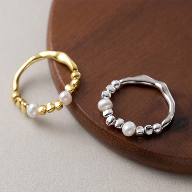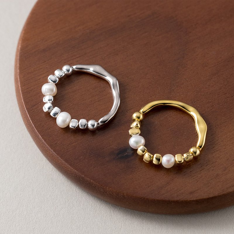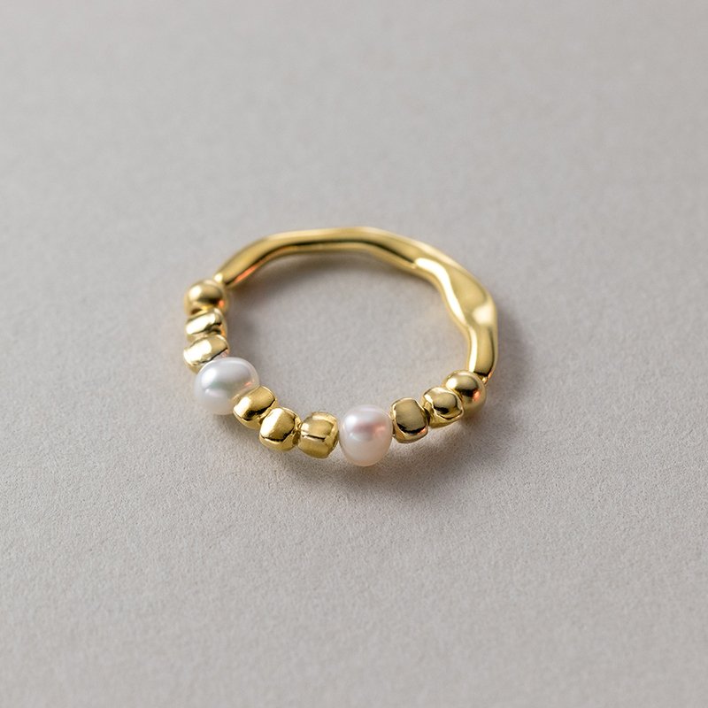 The band of the ring is meticulously crafted to create a distinctive and eye-catching design. The natural baroque pearls, known for their irregular and organic shapes, add a touch of elegance and charm. Each pearl is carefully selected to ensure its quality and unique beauty, making every ring truly one-of-a-kind.