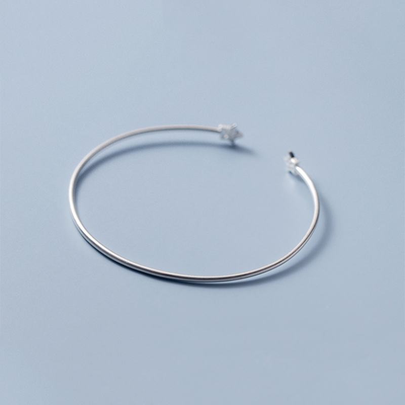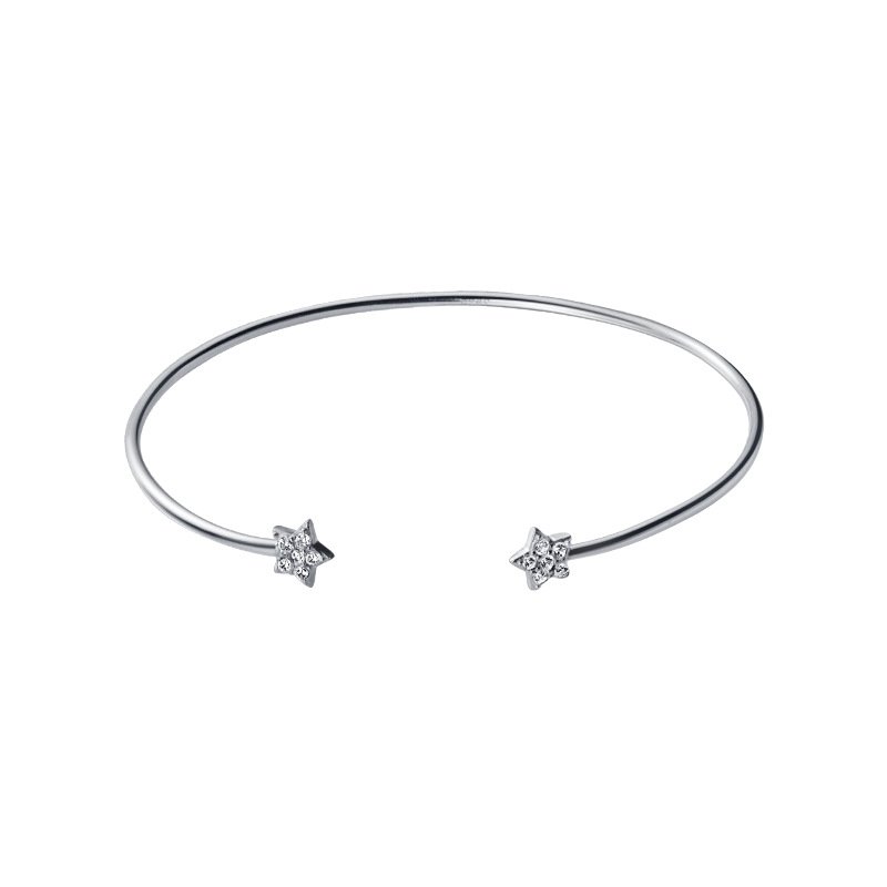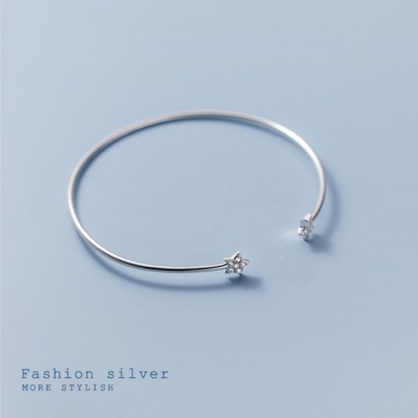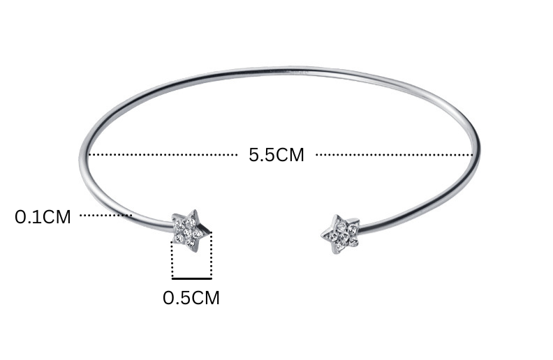 The bangle features a delicate and open design, gracefully encircling your wrist with a touch of celestial charm. Adorning the bangle are two romantic star charms embellished with shimmering zircon stones, adding a captivating sparkle that catches the light with every movement.